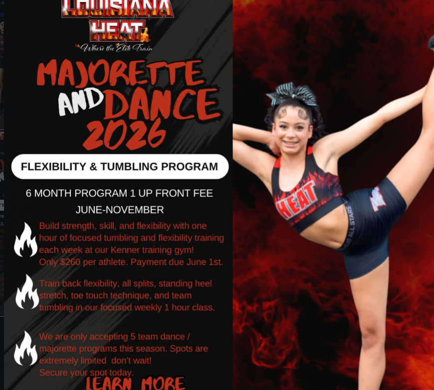 ποΈ Mandatory Parent Meeting: May 13, 2026 @ 6:30 PM π€Έ Tryout Days: May 16-17, 2026 π Location: 2001 34th Street, Kenner, LA 70065